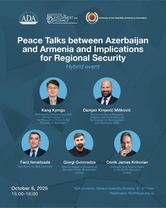 Koreya Respublikasının ölkəmizdəki səfiri Kanq Kımqu Koreya Səfirliyi və ADA Universiteti tərəfindən birgə təşkil olunan “Azərbaycan və Ermənistan arasında aparılan sülh danışıqları və regional təhlükəsizlik üçün nəticələri” adlı hibrid seminara qatılaraq açılış nitqi ilə çıxış edib.