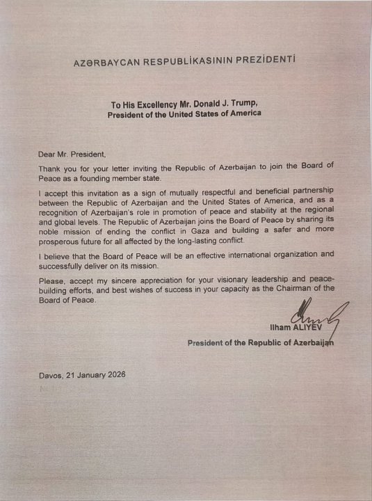 "Sülh Şurasına təsisçi üzv dövlət qismində Azərbaycan Respublikasını dəvət etdiyiniz məktuba görə Sizə minnətdaram.