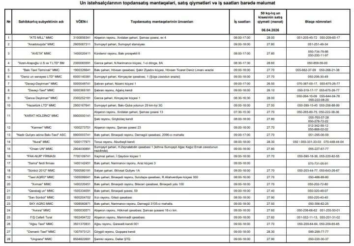 Aprelin 6-da Azərbaycanda un istehsalçılarının topdansatış məntəqələrində 50 kq-lıq un kisəsinin satış qiyməti 26,1-28,6 manat arasında dəyişib.